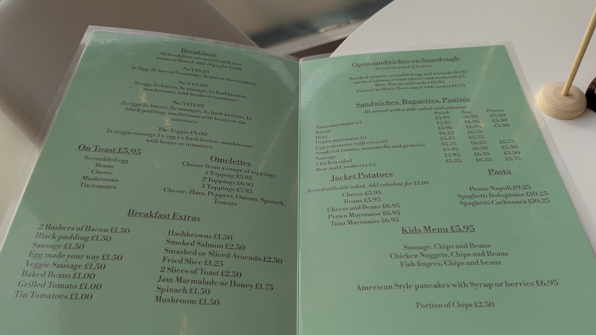 - Kids Menu: Includes classic child-friendly options such as sausage with chips and beans, chicken nuggets with chips and beans, fish fingers with chips and beans, and American-style pancakes served with syrup or berries.